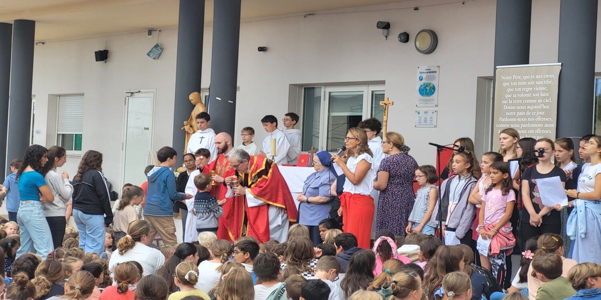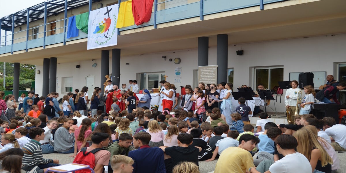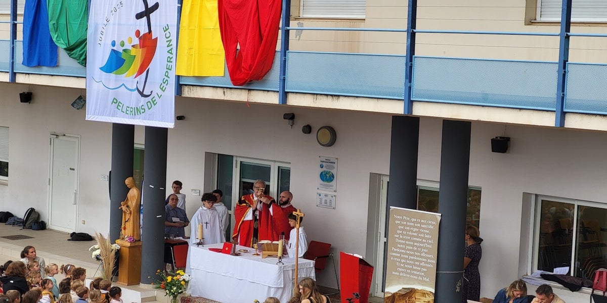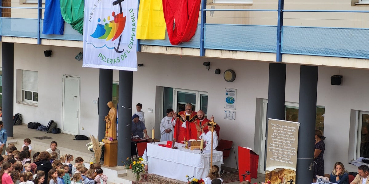 Cette belle journée festive a commencé par une grande messe qui rassemblait petits et grands dans la cour du bâtiment Euphrasie Barbier et sous une nouvelle bannière : Celle de l’entrée en Jubilé proclamé par le Pape François pour l’année 2025 « Pèlerins de l’Espérance ». Nous étions accompagnés des Pères Jérôme DERNONCOURT et Kevin CASSIDY de la Paroisse de l’Immaculée Conception de la Loubière.