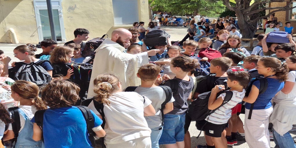 En ce début d’après-midi du mardi 9 septembre les élèves se sont rassemblés dans la cour pour la bénédiction de leur cartable. Cette année est sous la protection de deux saints Pier Giorgio Frassati et Carlo Acutis, que nous découvrirons tout au long de l’année. Au-delà de la bénédiction du matériel de classe, c’est chaque enfant qui a reçu la bénédiction du Seigneur.