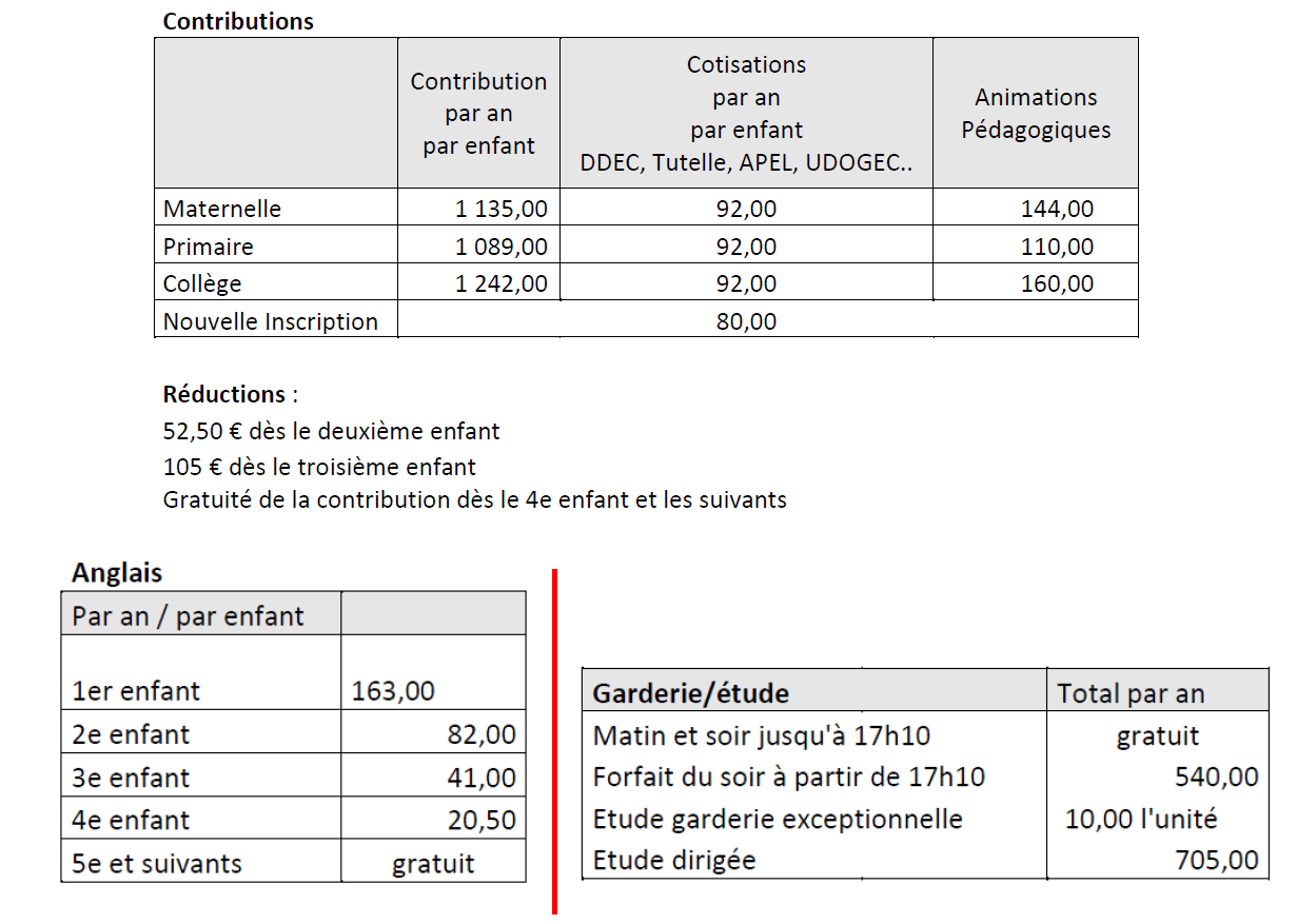 Tarifs de l'année scolaire 2025 - 2026